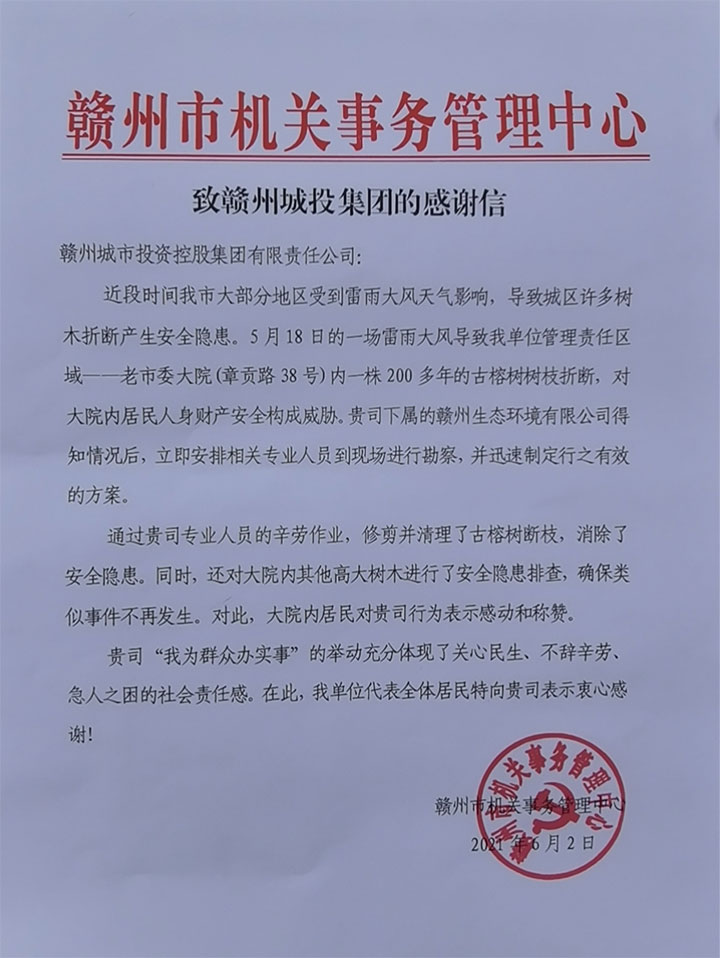 近日,贛州市機關(guān)事務(wù)管理中心發(fā)來一封感謝信,點贊贛州城投集團深入開展“我為群眾辦實事”實踐活動的感人舉動。