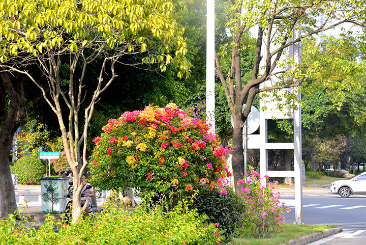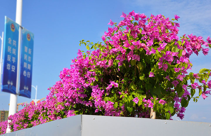 為迎接國慶,贛州生態(tài)環(huán)境有限公司在市園林環(huán)衛(wèi)管理中心技術(shù)人員的指導(dǎo)下利用多種新工藝、新手法、新技術(shù)進(jìn)行控花,以保證三角梅在國慶期間同時(shí)綻放,爭鮮斗艷。同時(shí),今年在興國路還種植了五彩三角梅,不同顏色的花朵在一棵三角梅植株上同時(shí)開放,吸引了市民們的注意,引來許多市民“打卡”觀賞。