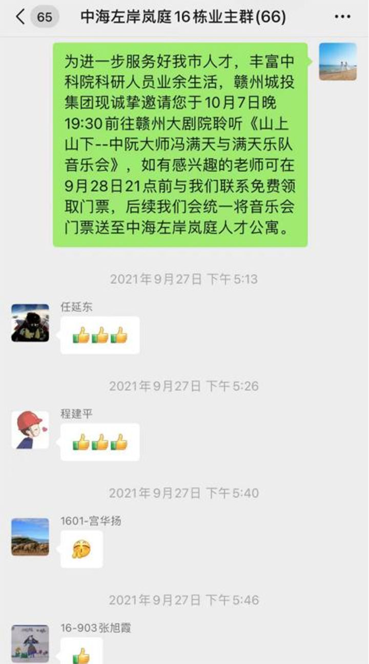 9月17日,支部書記帶隊(duì)再次到人才公寓走訪,了解到科研人員平時(shí)忙碌、業(yè)余文化生活不豐富,大部分科研人員中秋國慶期間因離家較遠(yuǎn)和疫情防控將留贛。為滿足人才精神文化需求,民晟實(shí)業(yè)公司聯(lián)合贛州市保利劇院管理有限公司,在“文化惠民”政策下,邀請留贛科研人員在贛州大劇院免費(fèi)聆聽“山上山下”中阮演奏音樂會(huì),黨員先鋒隊(duì)成員還專程送公益票上門。消息一經(jīng)人才公寓業(yè)主群發(fā)出,反響熱烈,獲得科研人員頻頻“點(diǎn)贊”?!案兄x你們的關(guān)心關(guān)懷和貼心服務(wù),讓我們國慶留贛能聽一場名家現(xiàn)場音樂會(huì)!”領(lǐng)票現(xiàn)場,一位科研人員說道。