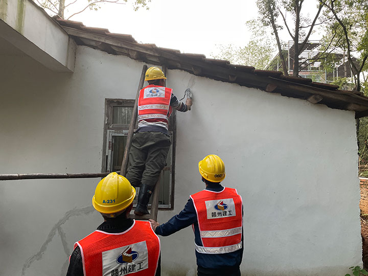 收到群眾訴求后,贛州建工集團(tuán)黨支部明確責(zé)任分工,由贛州建工集團(tuán)駐蓉江花園(四區(qū))項(xiàng)目部的工作人員前往實(shí)地了解情況。該村村民邱家飛年近七旬,所居住的房屋因年久失修,導(dǎo)致門廳墻面破損,房屋內(nèi)外均存在一定程度的裂縫。此外,村里另有一對(duì)姐弟居住的房屋由于結(jié)構(gòu)問題也存在幾處裂縫。