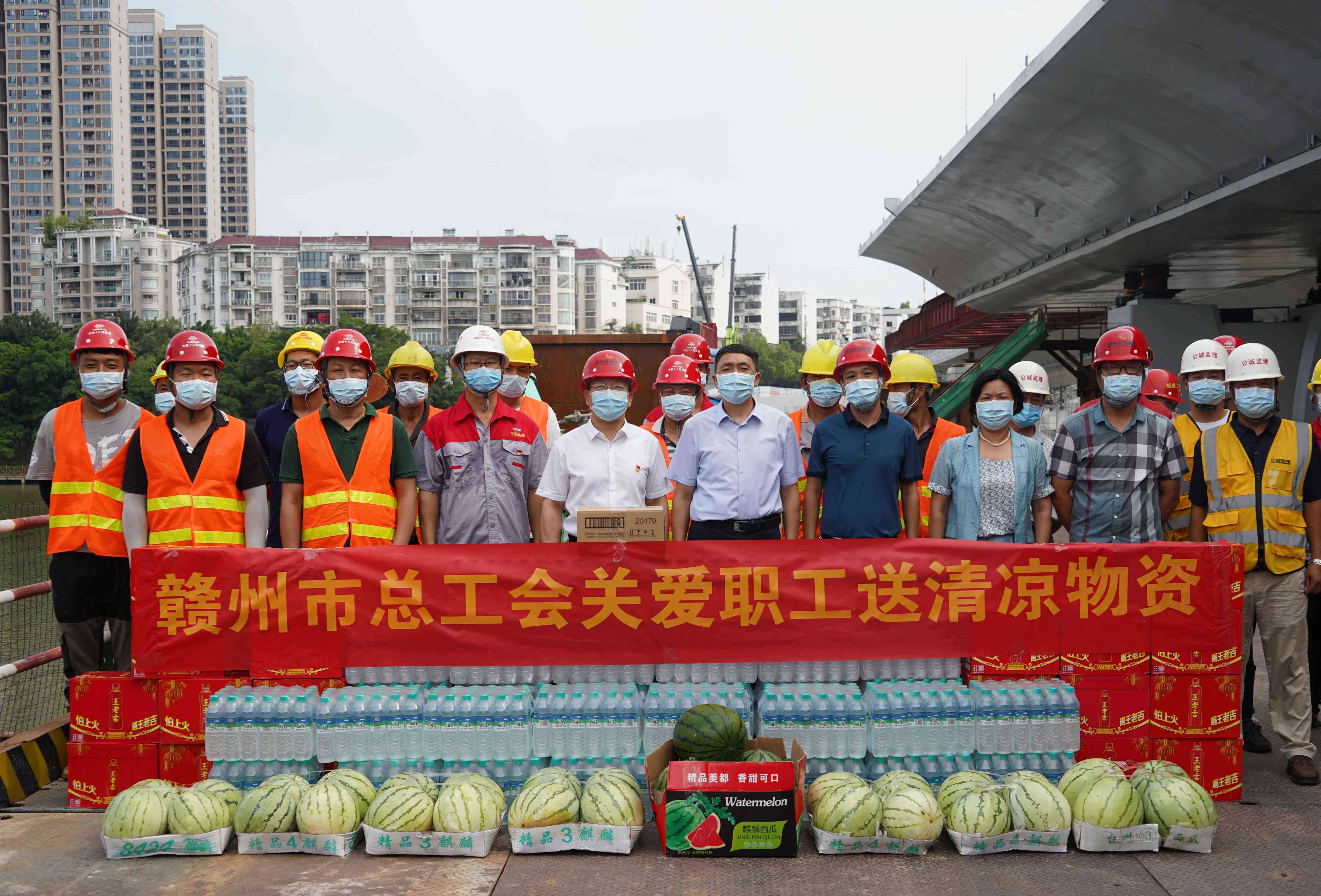 為鞏固解困脫困工作成果,提高職工生活品質(zhì),使高溫下作業(yè)的一線職工有更多的獲得感、幸福感、安全感,8月25日,贛州市總工會二級調(diào)研員賴定銘一行來到贛州城投集團南河大橋拓寬改造(二期)工程項目工地開展“關(guān)愛職工 夏送清涼”走訪慰問活動,送上市總工會的關(guān)懷。贛州城投集團黨委副書記黃家偉,工程管理公司相關(guān)負(fù)責(zé)人,集團工會、文化宣傳部、項目部業(yè)主、監(jiān)理和施工單位相關(guān)人員等參加慰問。