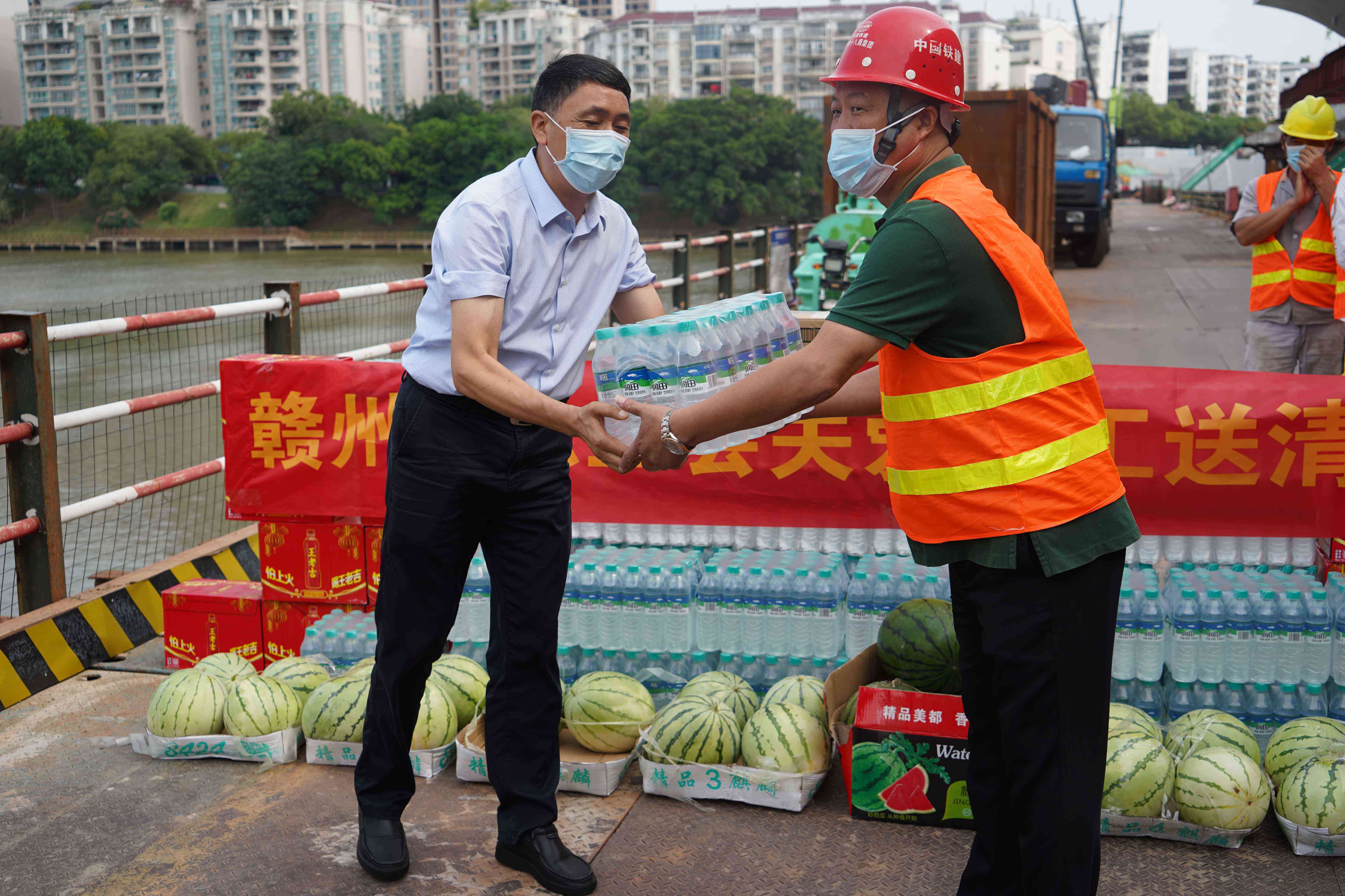 在慰問現(xiàn)場,賴定銘一行為南河大橋拓寬改造(二期)工程項目高溫下堅守崗位的一線職工發(fā)放了西瓜、礦泉水、王老吉等防暑降溫物品,并與項目一線職工交流談心,詢問了職工積極推進項目建設(shè)進展情況,聽取了贛州城投集團高溫津貼發(fā)放情況和落實高溫天氣作業(yè)勞動保護的有關(guān)措施,叮囑大家要科學(xué)安排高溫期間的施工任務(wù),要堅持勞逸結(jié)合,特別要注意身心健康和施工安全,要認(rèn)真做好項目工地疫情防控工作。
